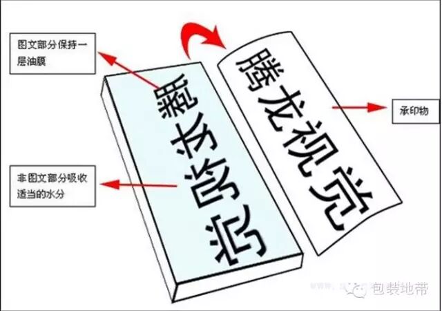 印版的图文部分和非图文部分保持表面相平,图文部分覆一层富有油脂的油膜,而非图文部分则吸收适当水分。上油墨时,图文部分排斥水分而吸收油墨,非图文部分因吸收了水分而形成抗墨作用。